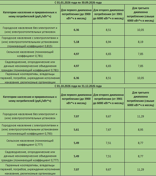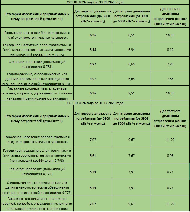 Тарифы на электроэнергию для населения на 2026 год (руб./кВтч) с НДС